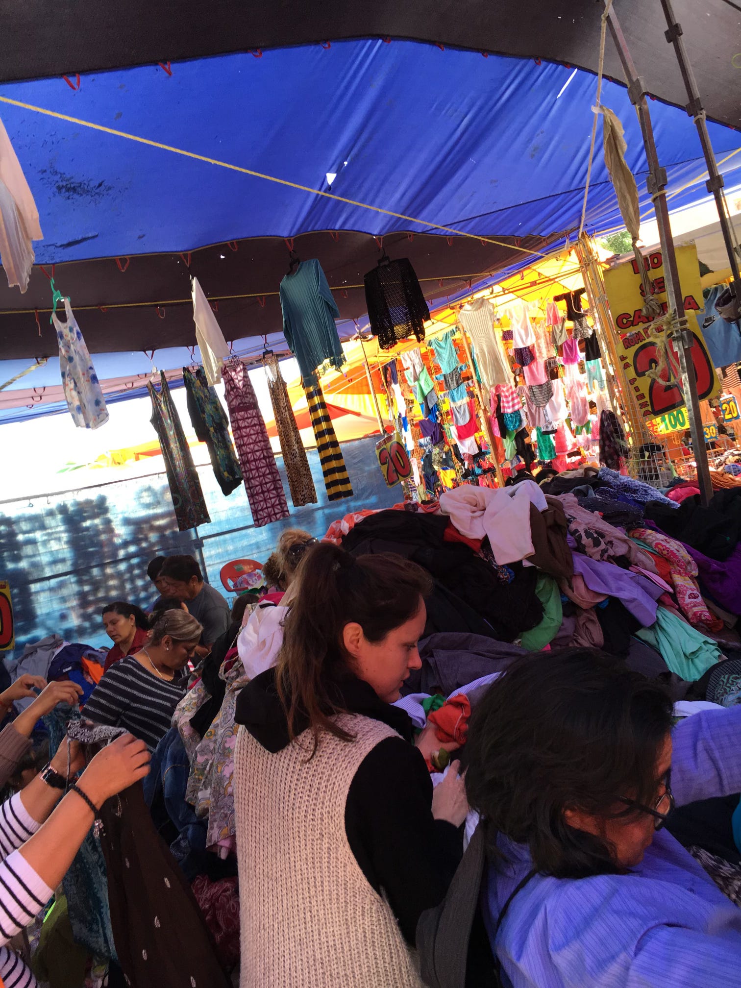 My dear friend Carmen Gama (of EILEEN FISHER and Make Aneew) visits the thrift markets in her hometown in Mexico on a regular basis. The markets in her town are mostly used by folks with less money and are on the outskirts of town. The entire market is secondhand. Most stalls (either tables or the floor) are sorted. There are stalls for bathing suits, sportswear, denim. The cheapest area has mountains of unsorted clothes where people dig for what they’re looking for, and this is where Carmen shops because she’s looking for real treasures.